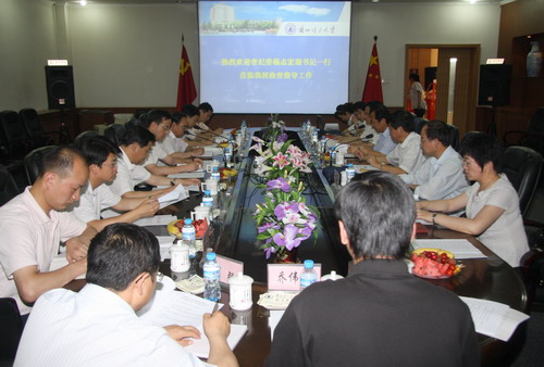 2009年6月19日下午,省纪委副书记、预防腐败局局长、省预防腐败试点工作领导小组常务副组长、领导小组办公室主任杨志宏一行到我校检查指导规范高校物资采购预防腐败试点工作,同行人员有省预防腐败试点工作领导小组办公室副主任、省纪委正厅级纪检监察专员潘锋、省纪委监察综合室主任牛彦之、省纪委政策法规研究室主任方亮,办公室成员贾屹冬、李向军、张杰。学校预防腐败试点工作领导小组副组长、副校长张国祥,校党委常委、试点工作办公室主任李骐及学校试点工作领导小组办公室成员参加了工作汇报会,汇报会由张国祥副校长主持。